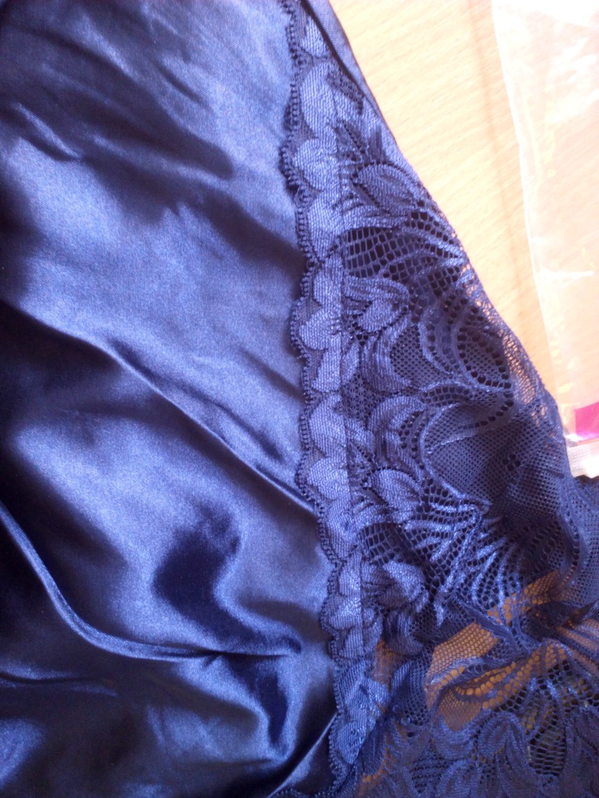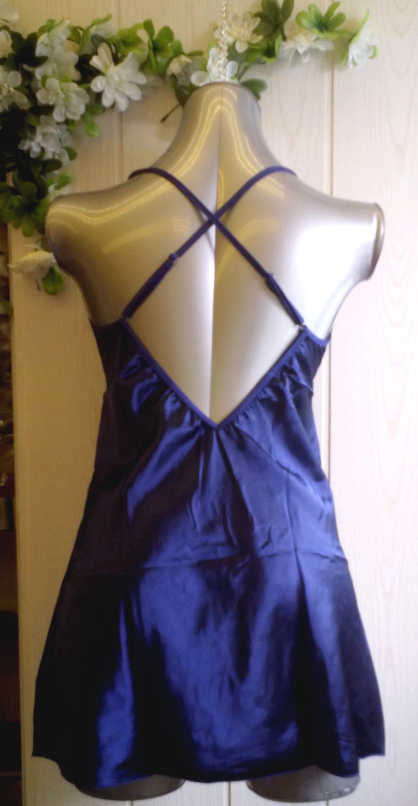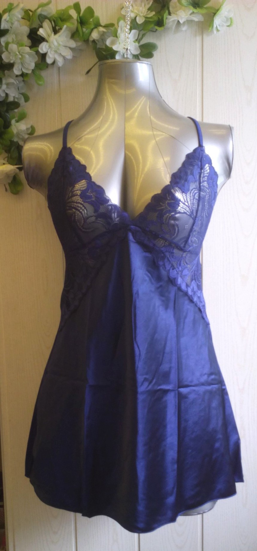 Атласная сорочка темно-синего цвета. Лиф выполнен из кружевной ткани. На спинке лямки выполнены крест-накрестр. В данной сорочке Вы почувствуете себя самой желанной.