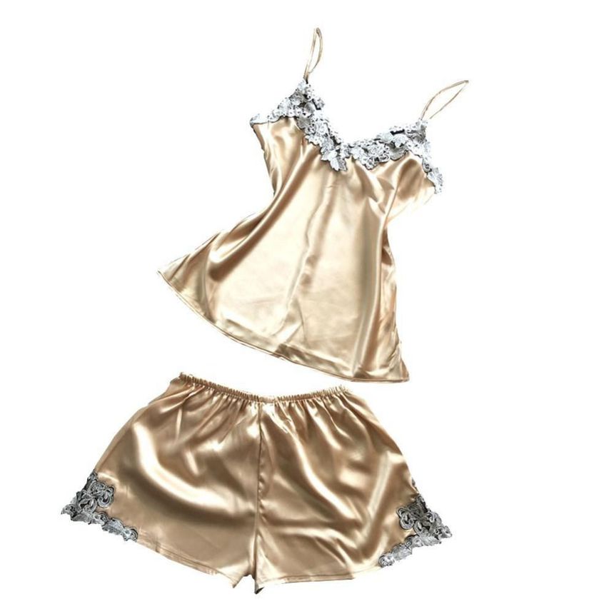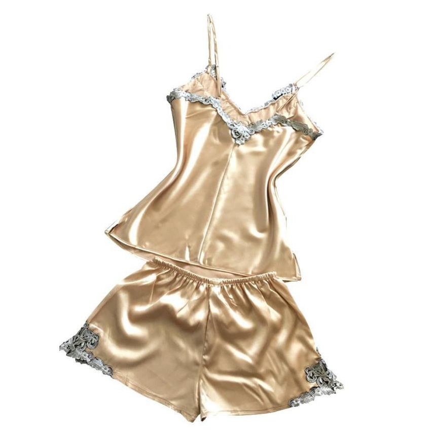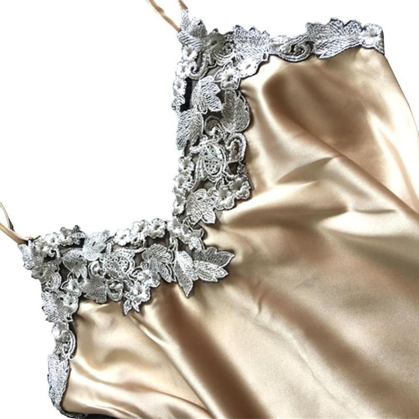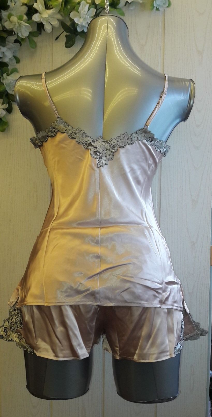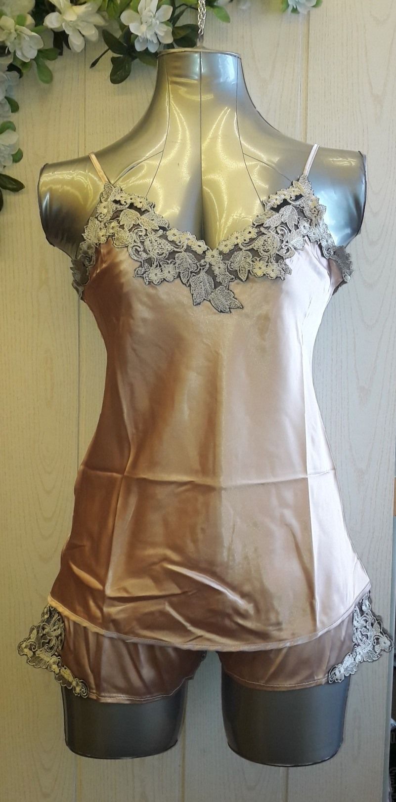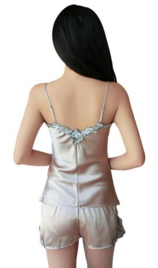 Нежный атласный комплект из майки и шортиков бежевого цвета украшен изысканным серо-коричневым кружевом. Бретели майки регулируются по длине. Выпускается в одном размере S-M
