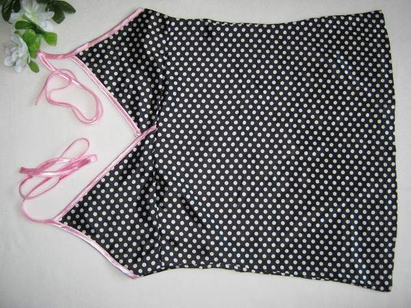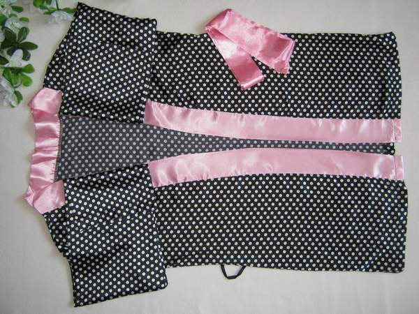 Элегантный черный в горошек комплект из пеньюара и короткой сорочки. Украшен розовой атласной лентой и такого же цвета поясом.