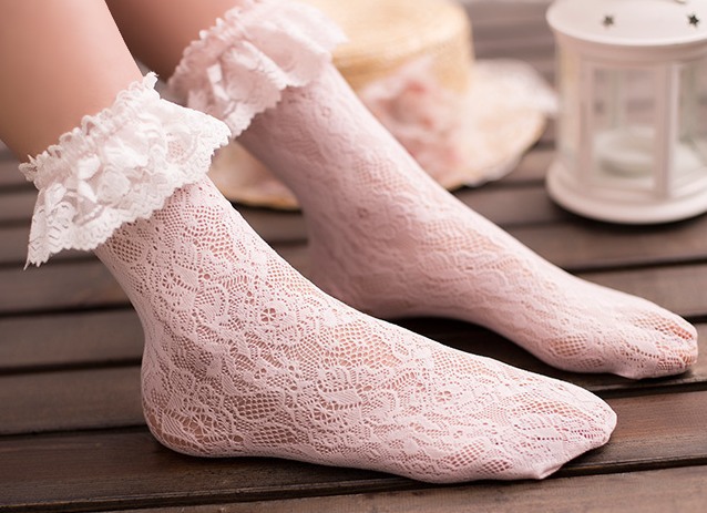 Белые носочки выполнены в технике чулочной вязки с цветочным узором. Верхний край украшен мягким кружевом. Станут отличным дополнением к эротическому костюму студентки или школьницы