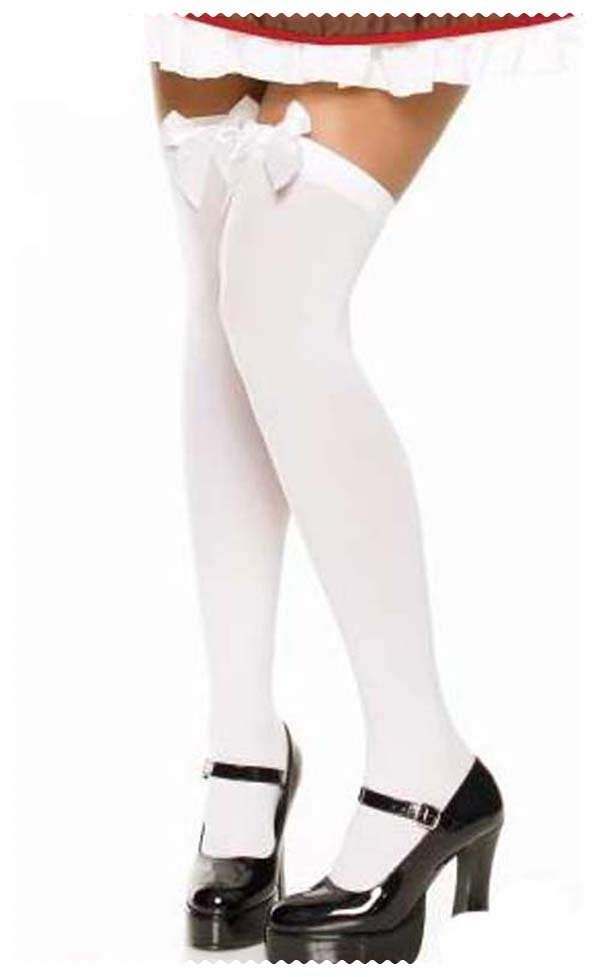Гладкие белые чулки без узора с атласными бантами белого цвета