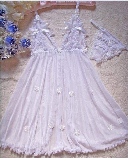 Комплект из прозрачной сорочки, украшенной белыми ромашками, и трусиков.