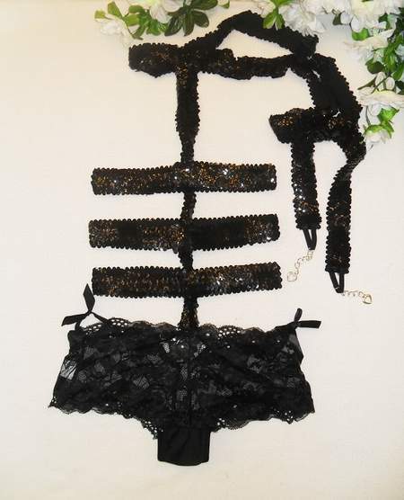 Нижняя часть боди представляет собой ажурные шортики, верхняя часть выполнена из эластичных лент, украшенных пайетками.