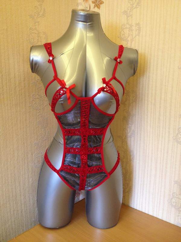 Откровенное боди с открытым бюстом. Перчатки в комплекте.