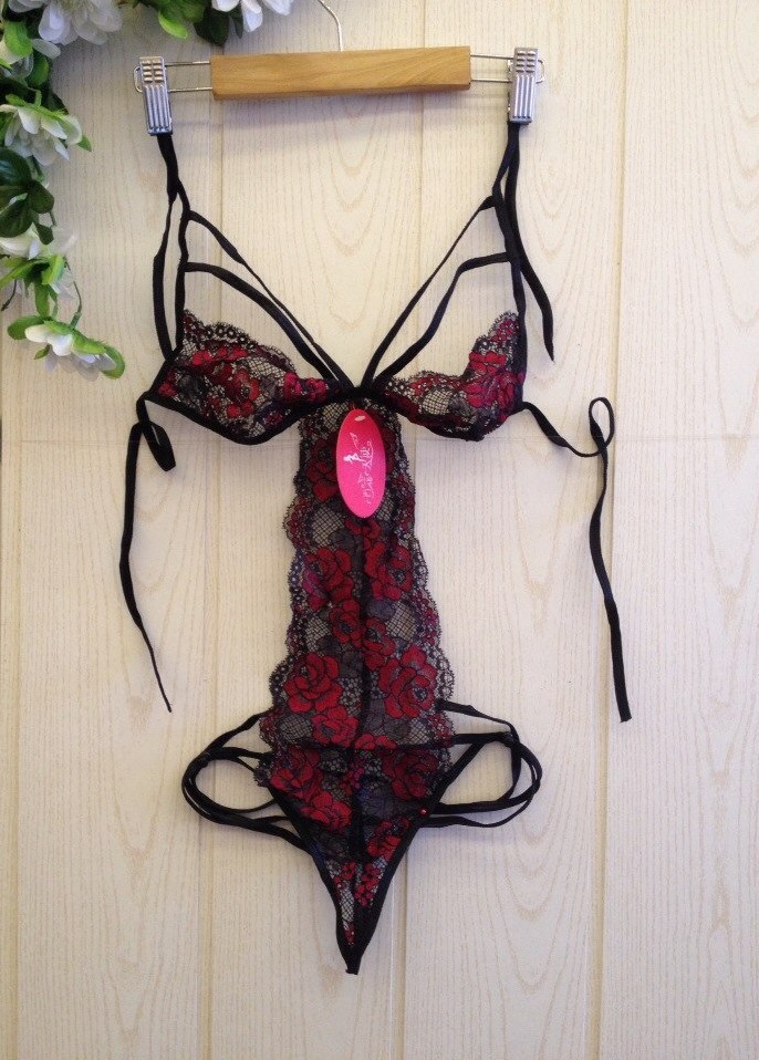 Боди обнажает верхнюю часть груди и скрывает нижнюю часть кружевом. Боди выполнено из кружева с ярким цветочным орнаментом.