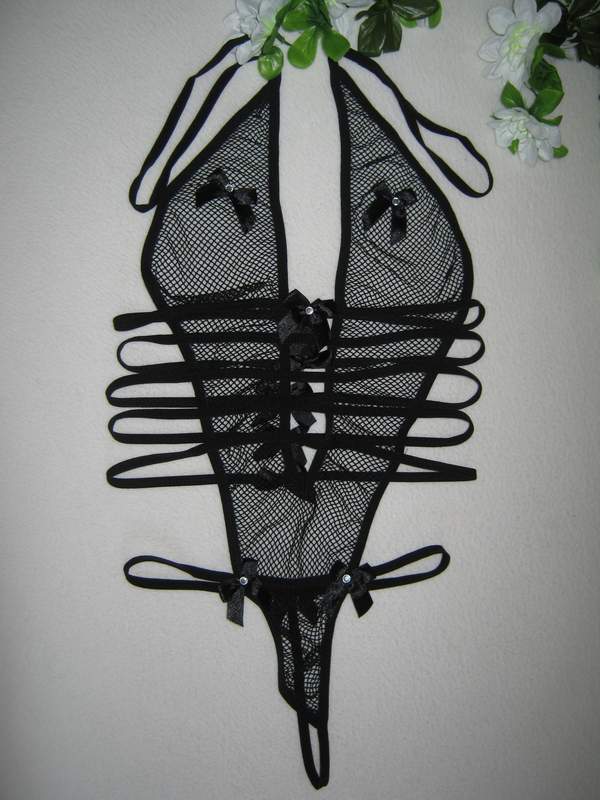 Пикантное боди в мелкую сетку фиксируется тонкими бретельками.