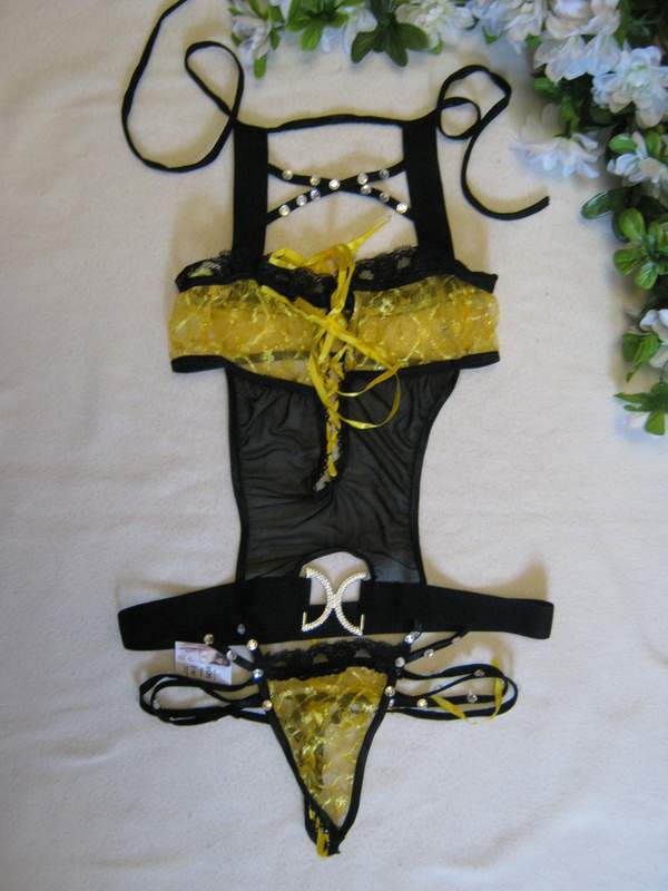 Сексуальное боди с кружевными вставками желтого цвета на трусиках и лифе.
