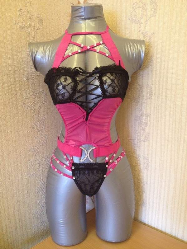 Сексуальное боди с кружевными вставками розового цвета на трусиках и лифе.