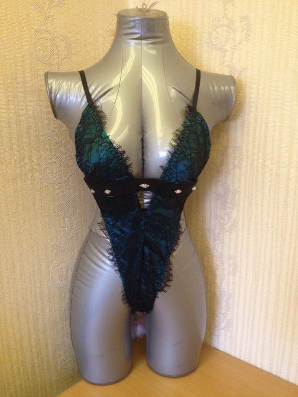 Соблазнительное боди выполнено из двух видов ткани - зеленой основы и черного кружева. Любой мужчина будет пленен вашей красотой.