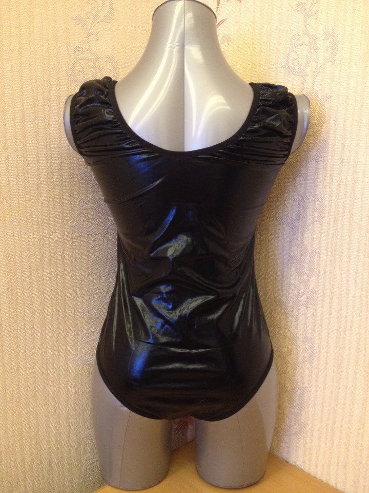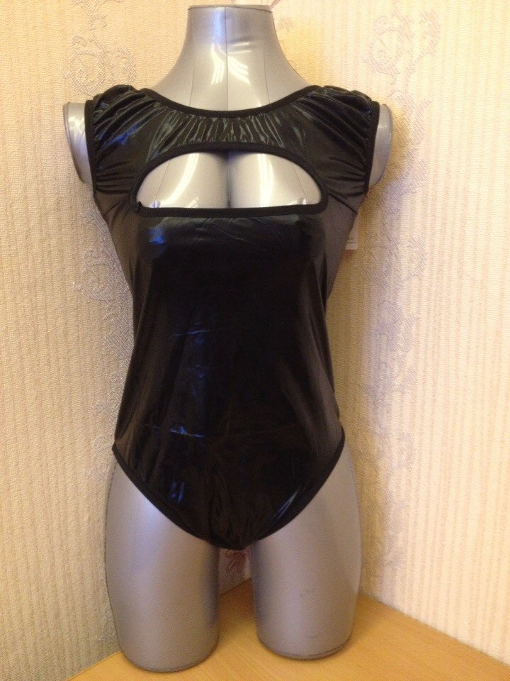 Сексуальное черное боди с вырезом в области груди. Выполнено из материала, имитирующего винил.
