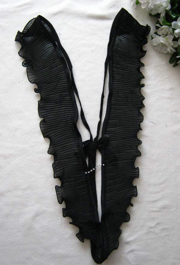 Соблазнительное боди, выполненное из двух гофрированных широких лент, соединяющихся на спине в одну нить и украшенное атласным бантиком. Спереди ленты удерживаются нитью из страз.