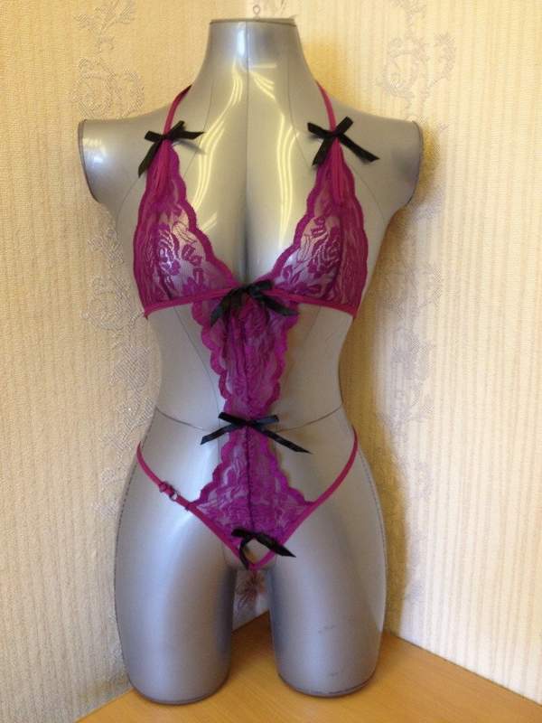 Женственное боди фиалкового цвета из мягкого кружевного материала. Сзади на завязках, резинка от трусиков регулируется