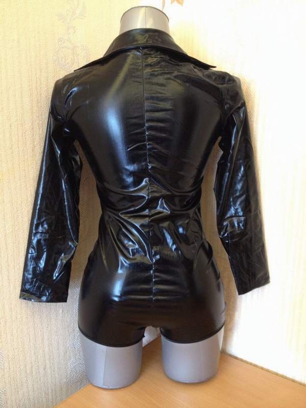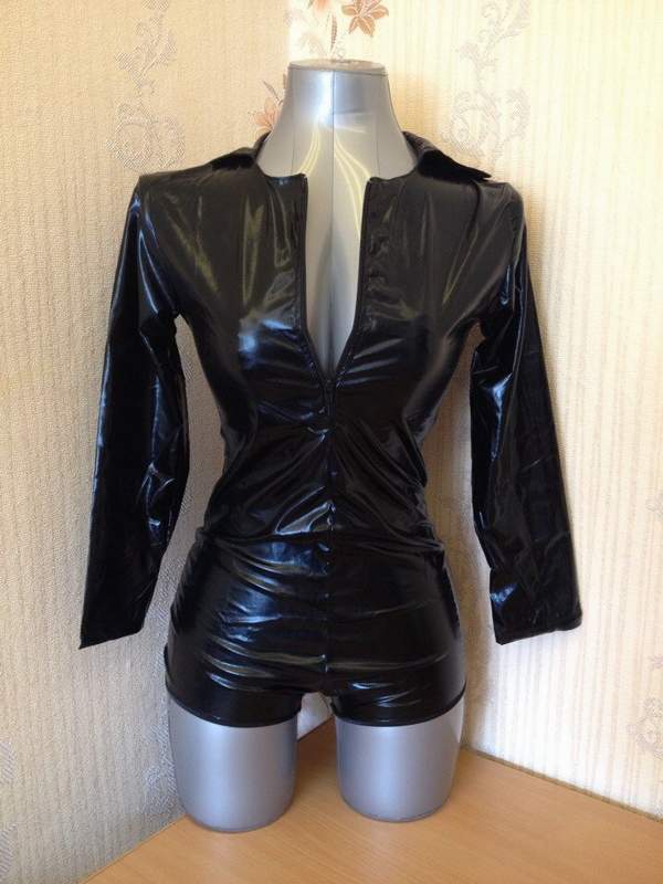 Облегающее виниловое боди на молнии с длинными рукавами.