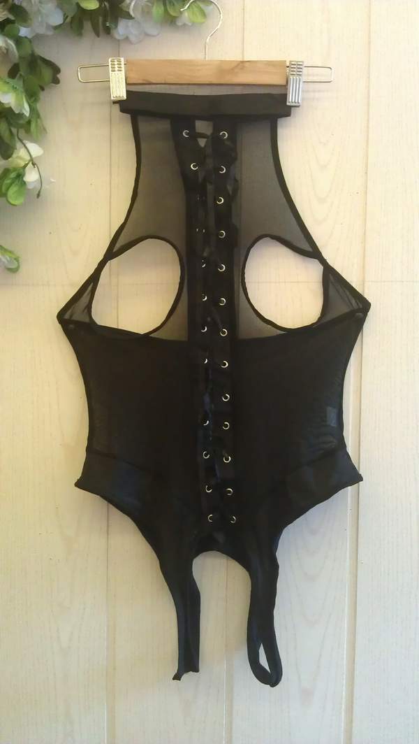 Полупрозрачное откровенное боди с откротой грудью и открытой промежностью. Спереди на боди шнуровка.