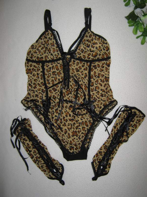 Сексуальное боди в комплекте с перчатками выполнены из эластичной ткани с леопардовым принтом.