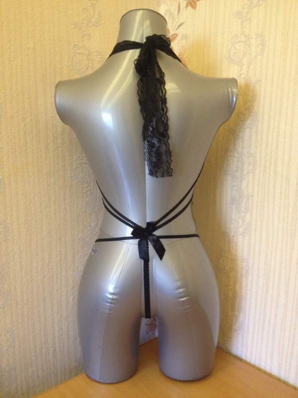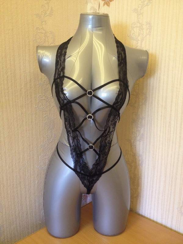 Откровенное боди спереди украшено брошами, фиксирующими переплетение завязок. На спинке завязки плавно переходят в трусики-стринги. Пикантность модели добавляет небольшой атласный бантик сзади.