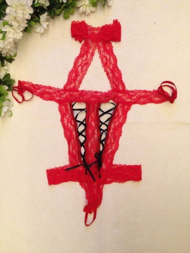 Ярко-красное откровенное кружевное боди с черной шнуровкой.