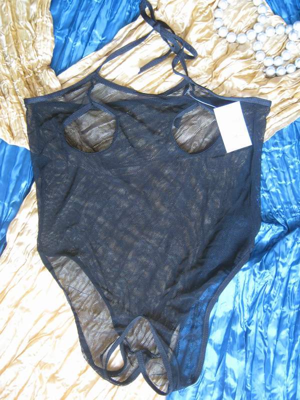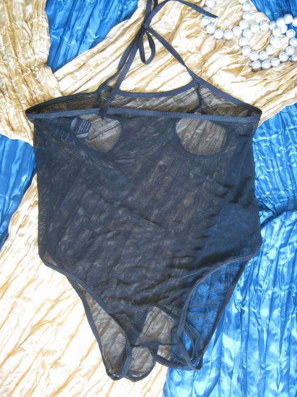 Сетчатое боди с вырезами на груди и разрезом между ножек.