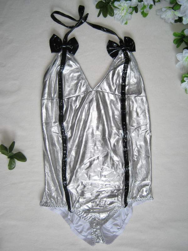 Харизматичное серебряное боди из ткани, имитирующей винил, с контрастной черной отделкой. Сзади на шнуровке.