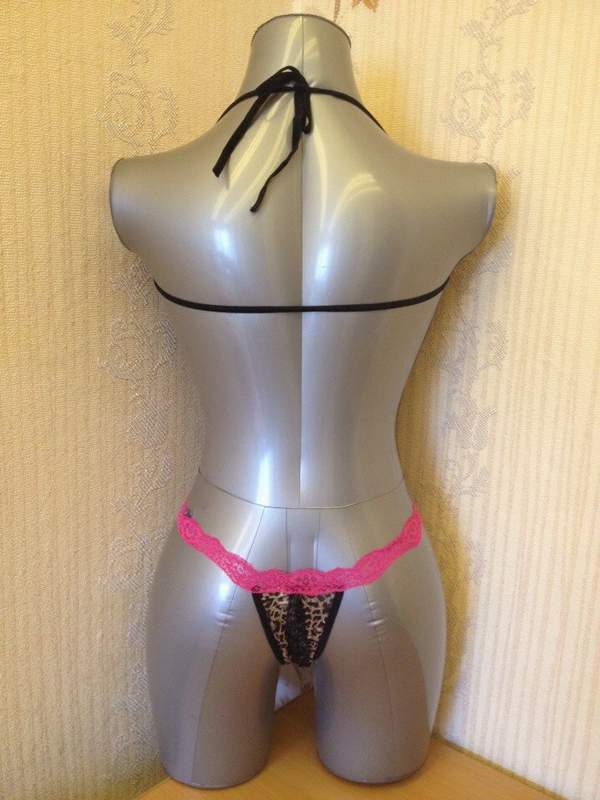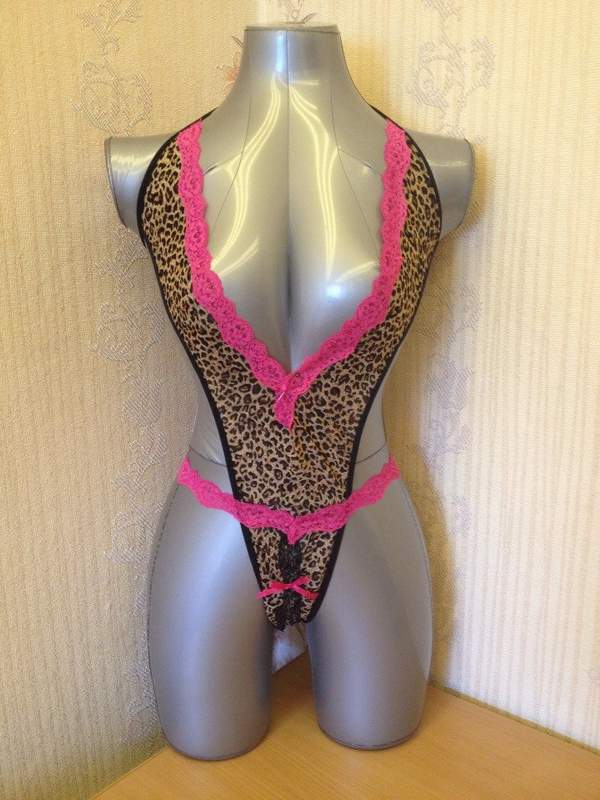 Откровенное боди с леопардовым принтом декорировано ярко-розовым кружевом. Завязывается на шее. Есть разрез в интимной части