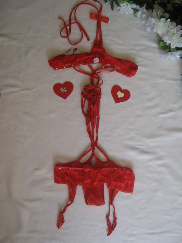Соблазнительное боди красного цвета, ленточки которого нежно обволокивают тело, создавая при этом интиригующее настроение. Для завершения образа в комплект входят пэстис в виде сердец и чулки в мелкую сетку, пристегивающиеся к боди подвязками.