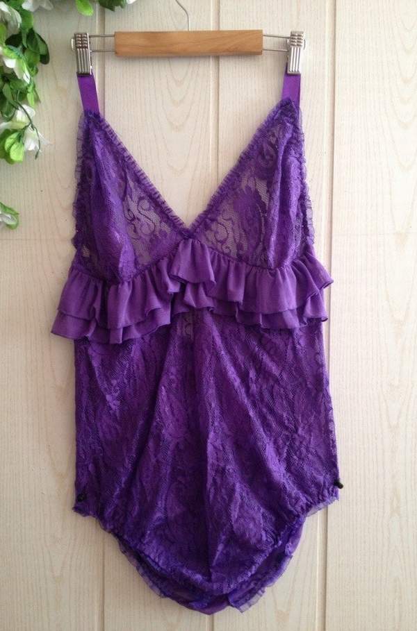 Сетчатое ажурное боди чарующего пурпурного цвета с несъемными подвязками для чулок.