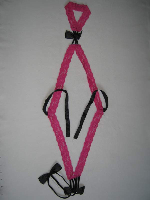 Эротический кружевной комплект образовывает изящный узор на теле. С помощью атласных лент завязывается на спинке в красивый бант. Ширина кружева - 3,5 см.
