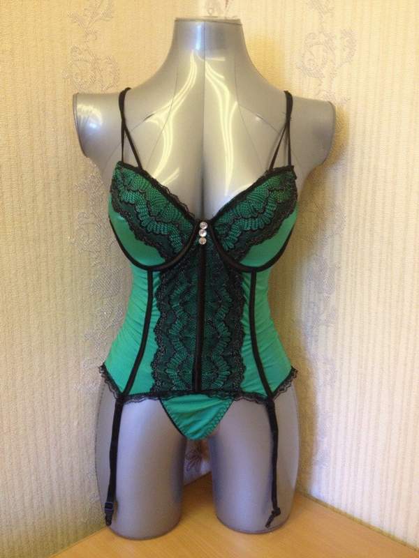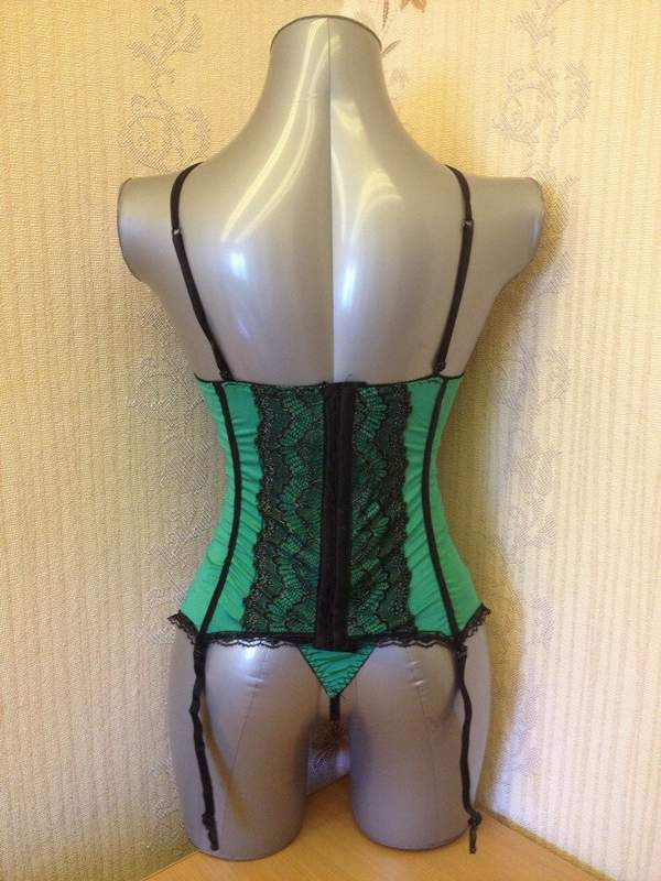 Зеленое бюстье с черной кружевное отделкой и подвязками для чулок. Сзади застежка-крючочки.