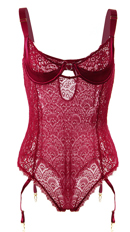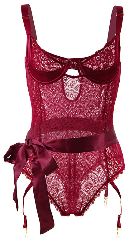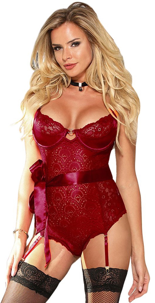Бодовое кружевное бюстье с атласным поясом. На спинке застежка-крючки. В промежности застегивается на 3 пластиковые клепки. Выпускается в размерах M-L, XL-2XL, 3XL-4XL, 5XL-6XL