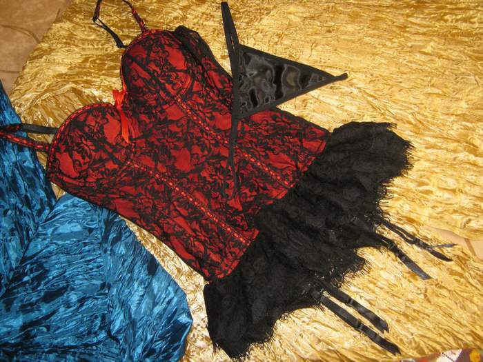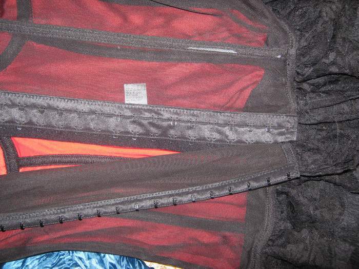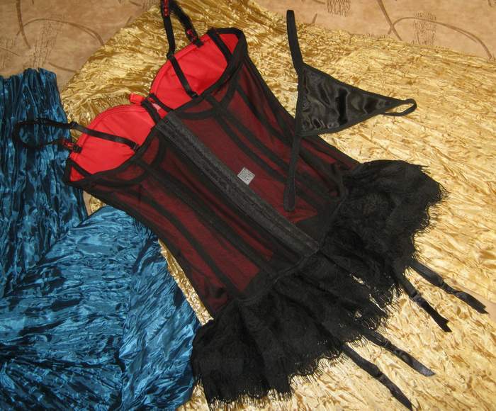 Мягкое бюстье на пластиковых косточках из приятного трикотажа. Спереди украшено черным кружевом. Сзади выполнено из тонкой мелкой сетки. Застежка - два ряда крючочков (сзади). Лиф на косточках. В комплекте трусики-стринги и съемные подвязки для чулок.