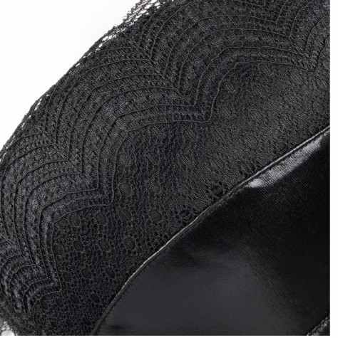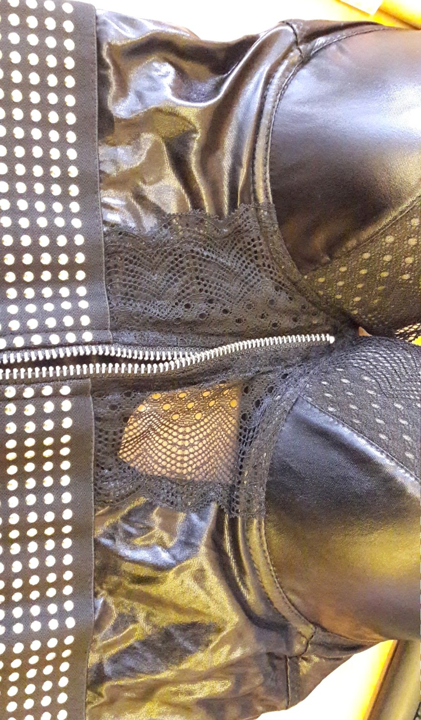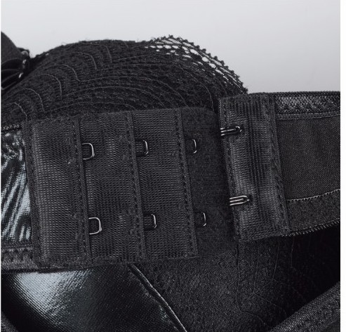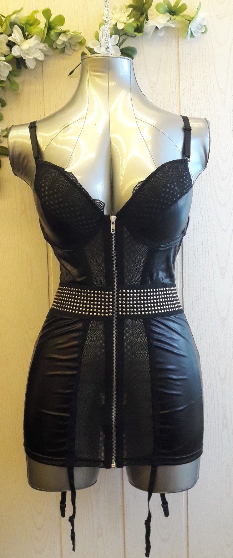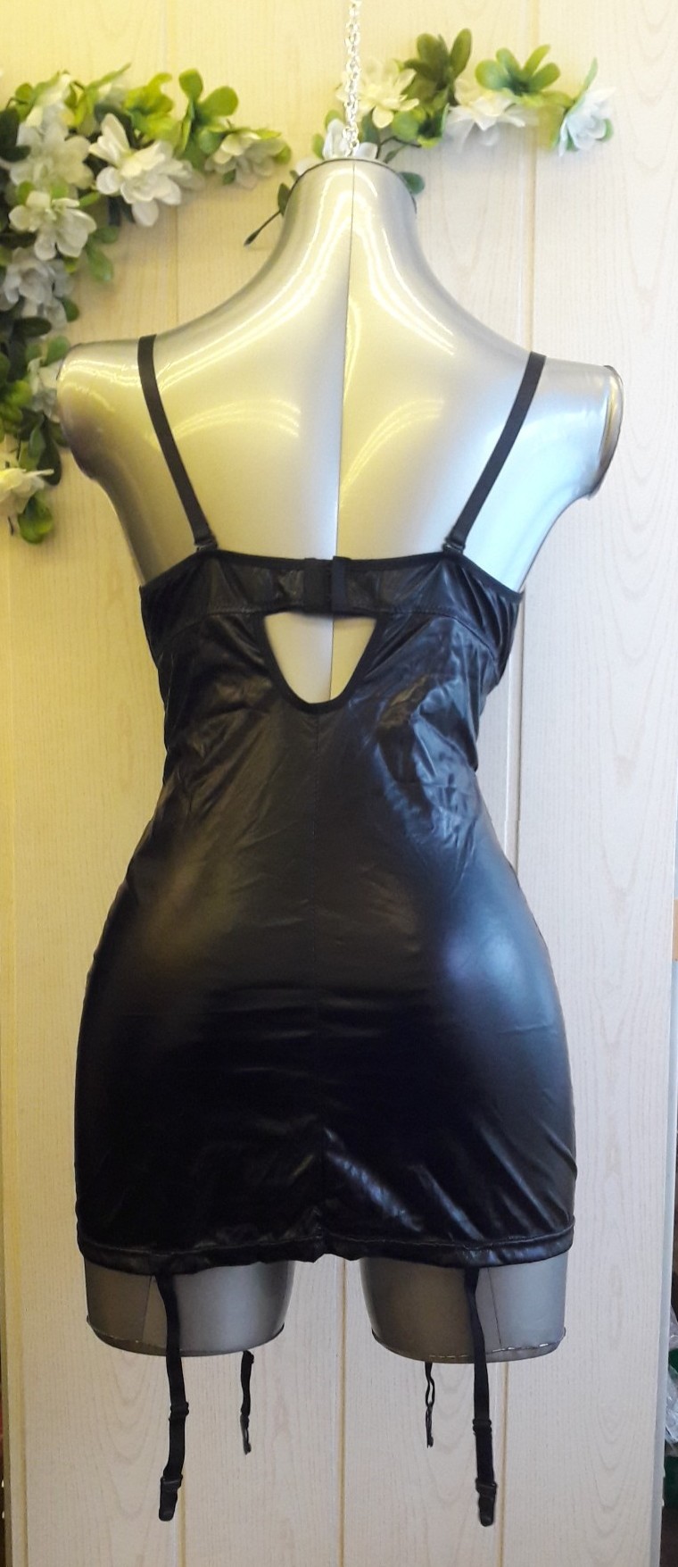 Платье выполнено из полиэстера, имитирующего винил, в сочетании с нежным черным кружевом.
