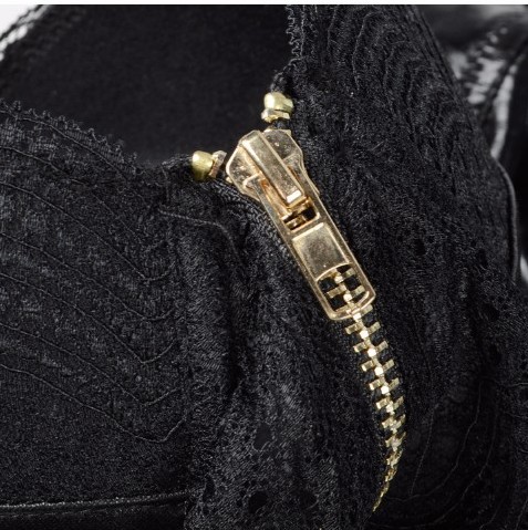 Спереди платье застегивается на молнию, у лифа сзади застежка-крючки.