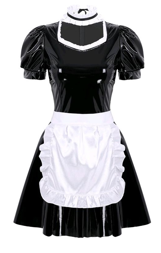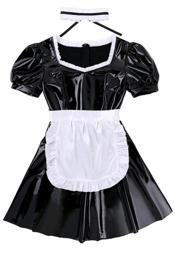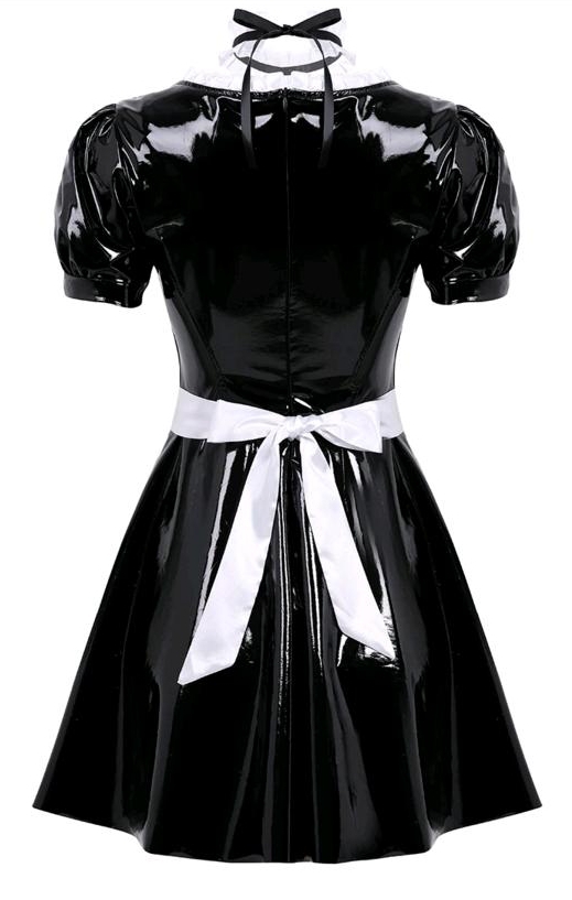 Костюм выполнен из эластичного винила. Сзади платье застегивается на потайную молнию.Воротник платья отделан белыми рюшами.