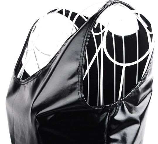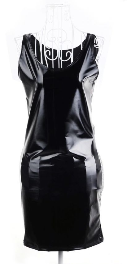 Данное платье выполнено из полиэстера - материала, имитирующего винил. Его особенность заключается в эластичности и обтягивании фигуры (у винила такой особенности нет).