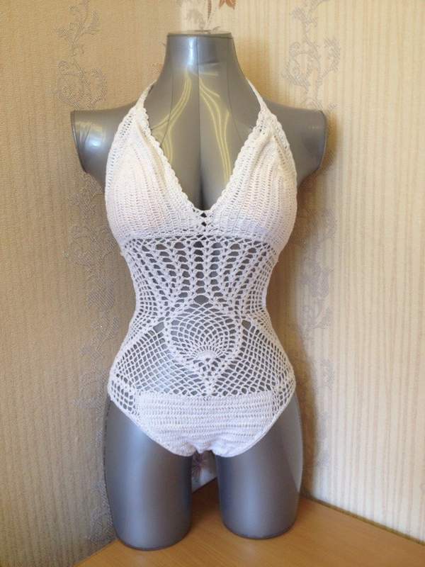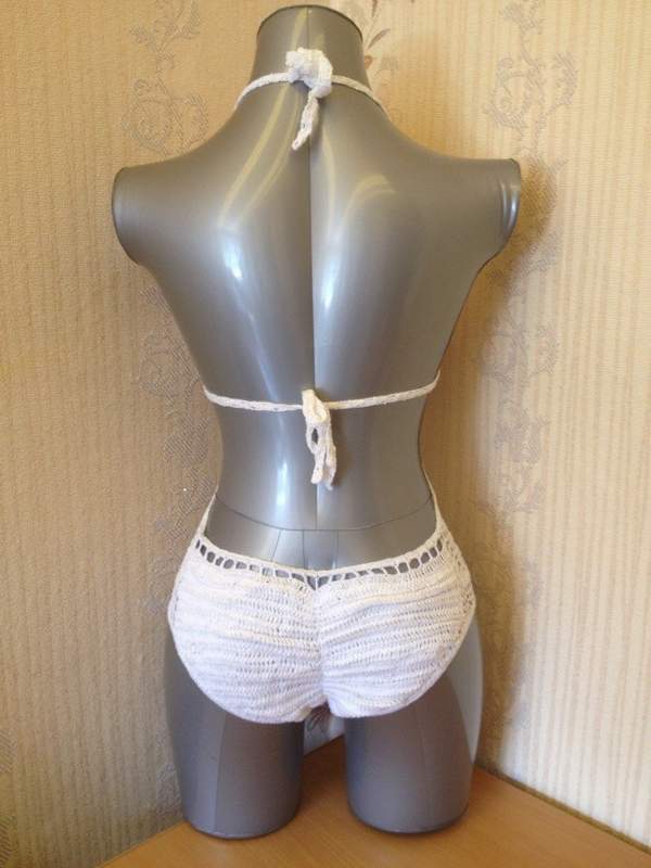 Вязаный купальник станет ярким дополнением к пляжному гардеробу любой девушки. Лиф и трусики купальники уплотнены хлопковой тканью и соединены широкой вязанной полосой. На попке купальник имеет сборку.