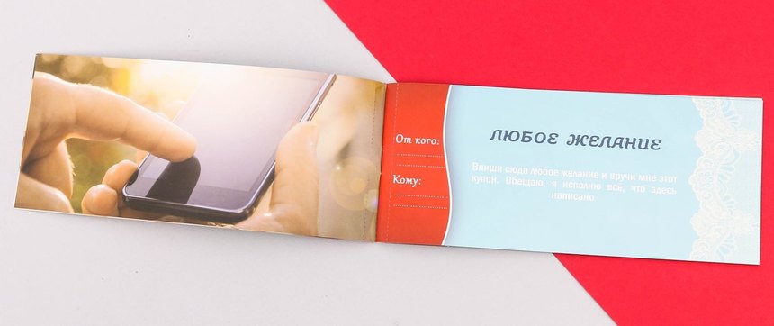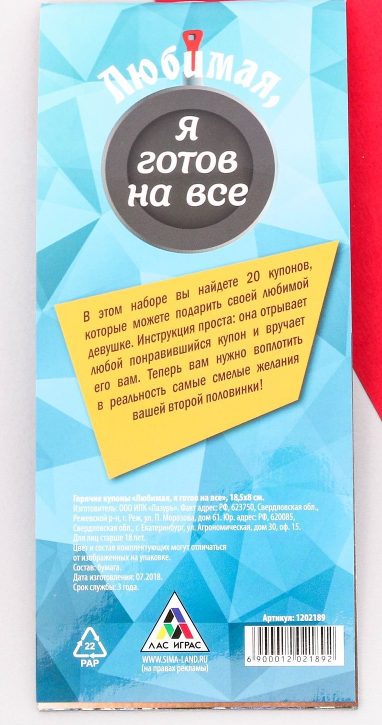 В наборе вы найдёте купоны, которые отдадут вас целиком во власть желаний возлюбленной. Девушка открывает любую понравившуюся карточку и вручает её вам, когда захочет. Вы же обязуетесь воплощать все горячие фантазии любимой!