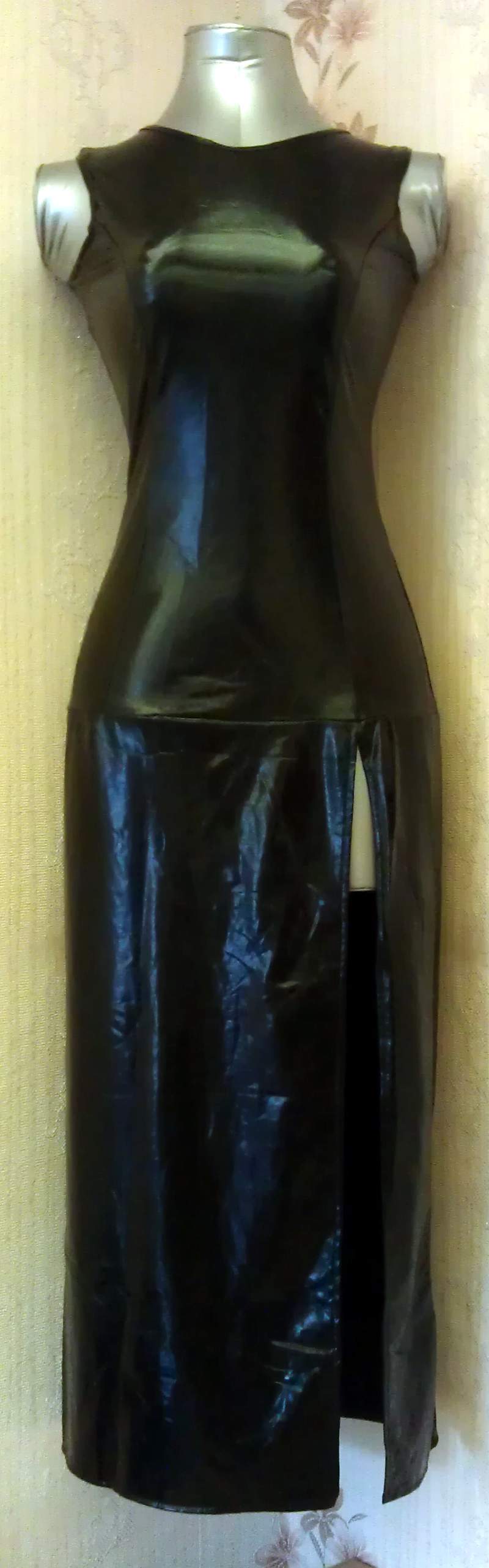 Длинное облегающее платье черного цвета с сексуальным разрезом.