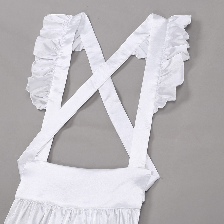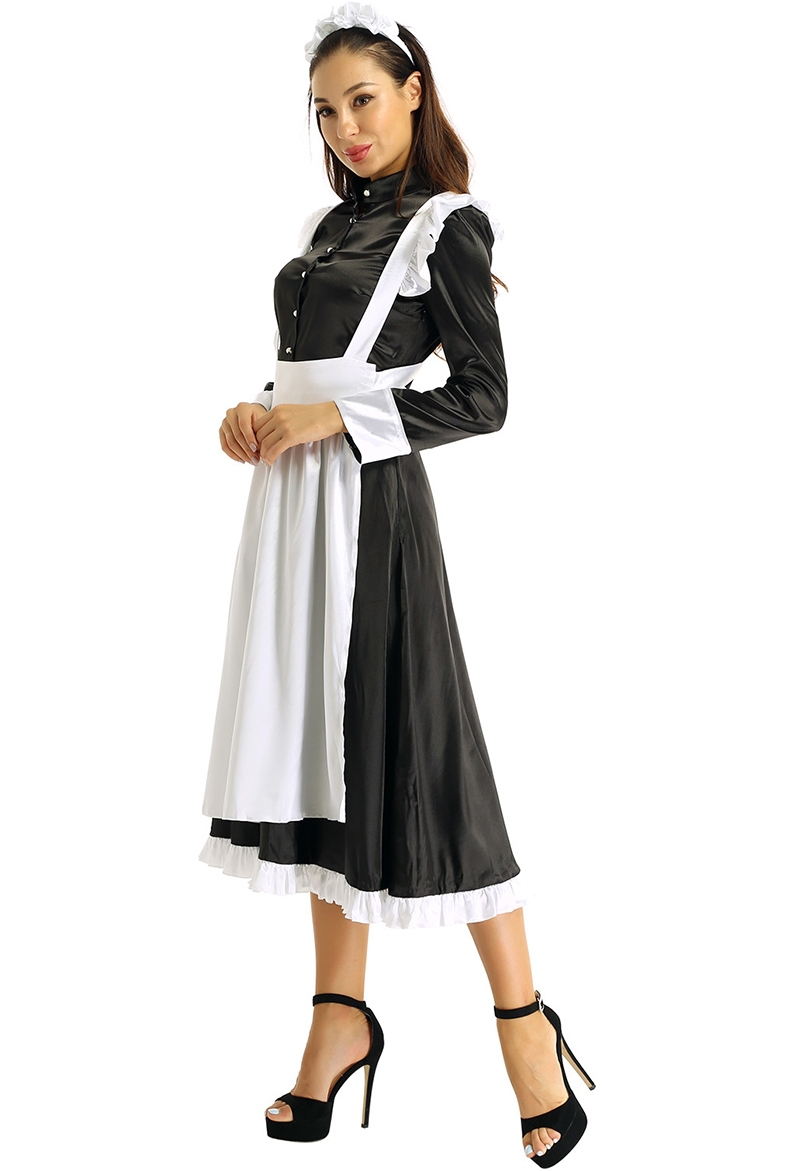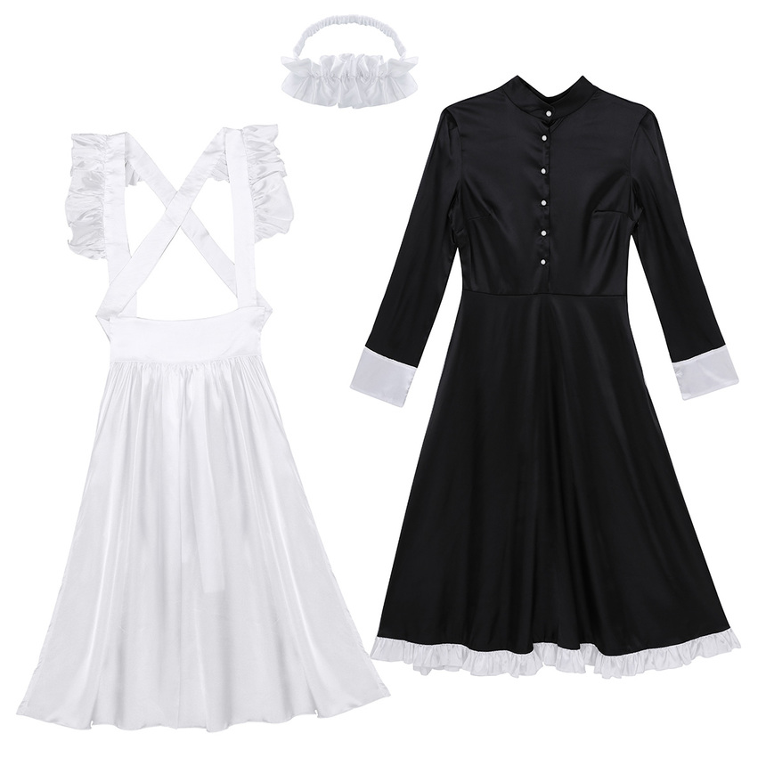 Длинное платье горничной и фартук выполнены из атласной ткани. Сзади платье застегивается на пуговицы, сбоку потайная молния. Подол платья и манжеты отделан белым атласом.