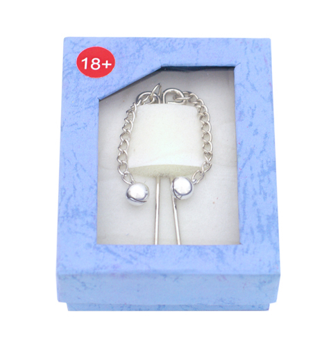 Интимное украшение на половые губы в виде зажима с бубенчиками. Выполнен из металла серебристого цвета. Не требует прокалывания.