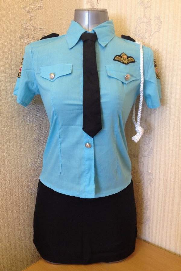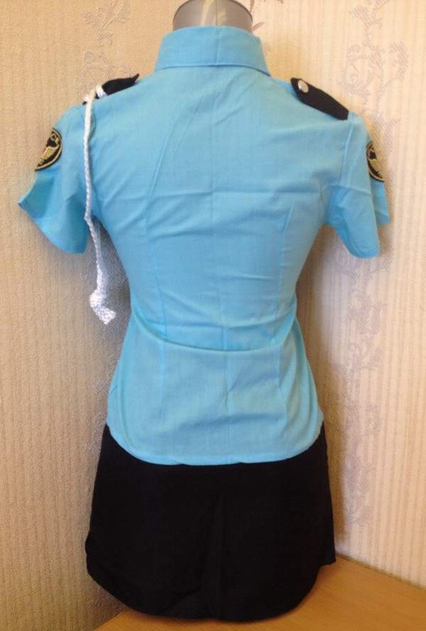 Сексуальный костюм из голубой рубашки на пуговицах и юбочки на молнии.