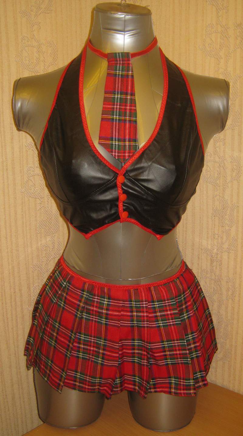 В комплекте виниловый черный топ, клетчатая плиссированная юбка, галстук и трусики.