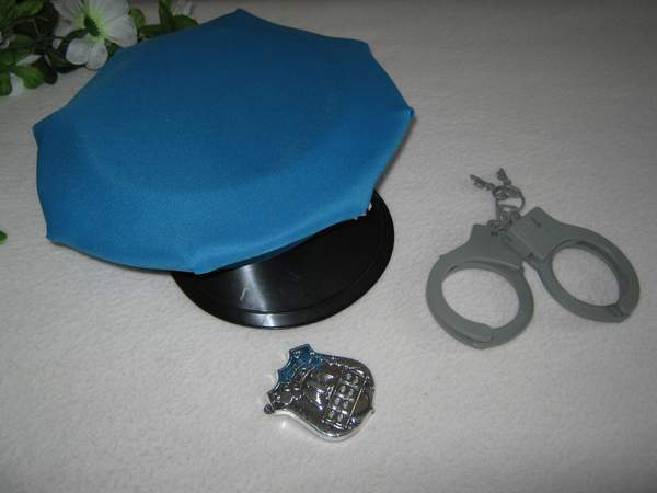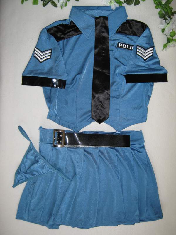 Игровой костюм состоит из топа на клепках и юбочки на молнии из эластичной ткани, галстука, пояса, пластмассовых наручников и фуражки.