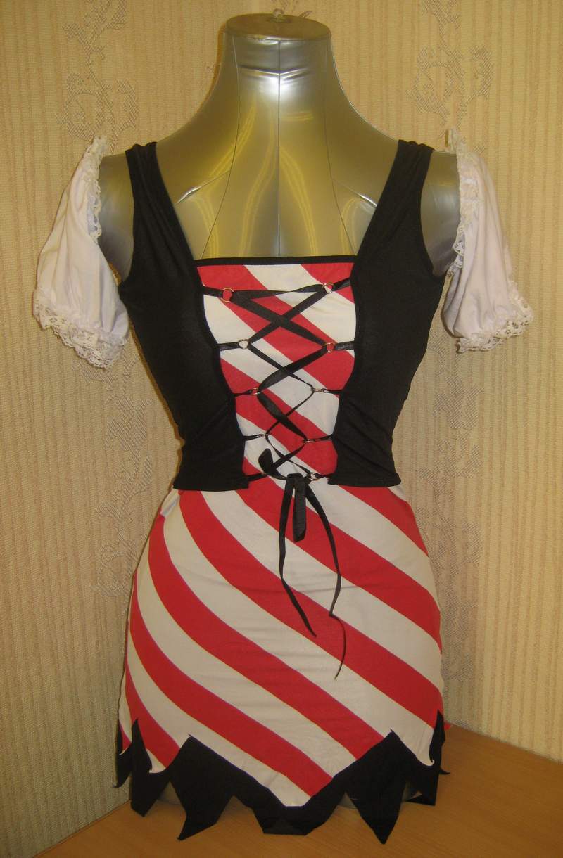 Сексуальный игровой костюм пиратки. Платье в красно-белую полоску с треугольным кроем снизу и шнуровкой спереди. В комплект также входят белые нарукавники в форме воланов, трусики-стринги, красная повязка на голову и повязка на один глаз.