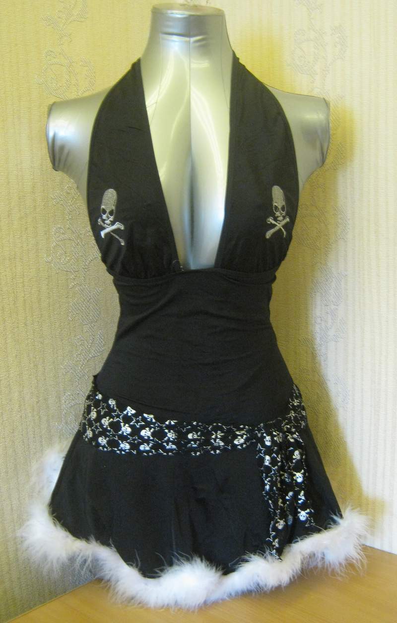 Черное платье с кринолиновым подъюбником украшенно серебрянными черепами в области груди. Пояс и трусики в комплекте.