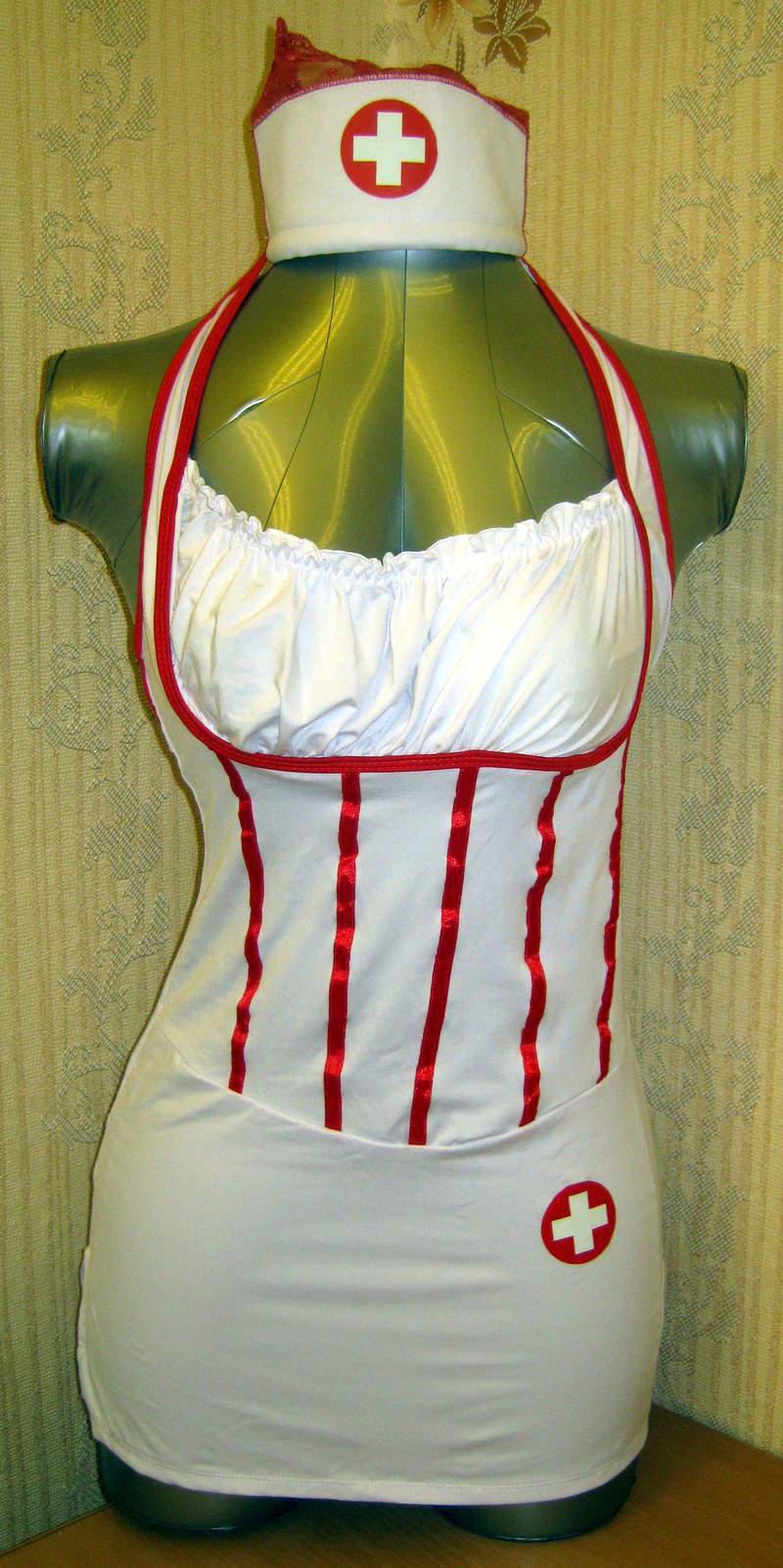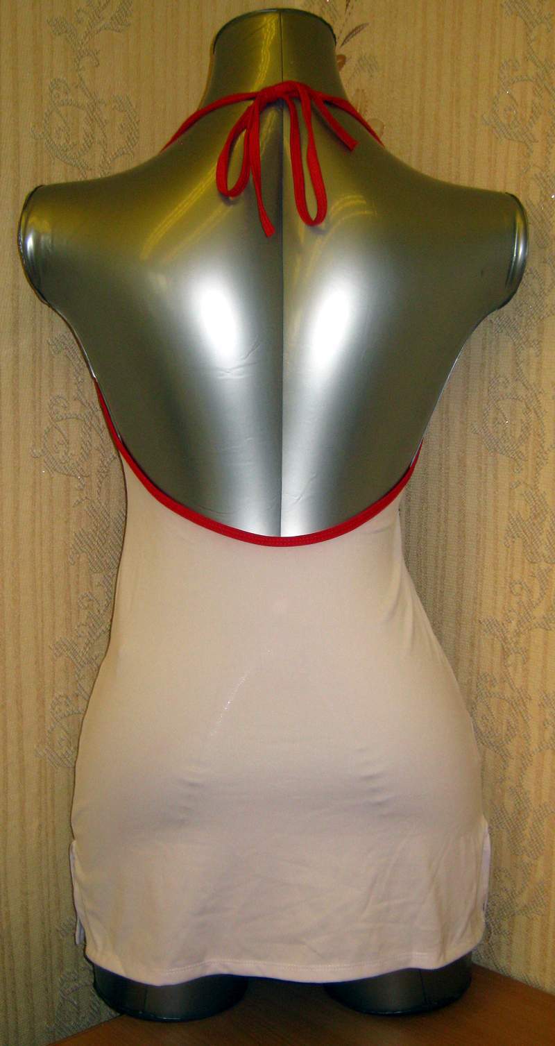 Игровой костюм игривой медсестры выполнен из белого материала и украшен полосами красного цвета. Платье эластичное, завязывается на шее.