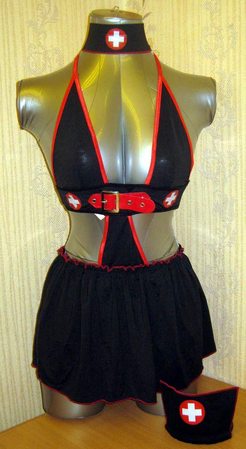 Соблазнительный костюм игривой медсестры выполнен из черного материала с окантовкой красного цвета.
