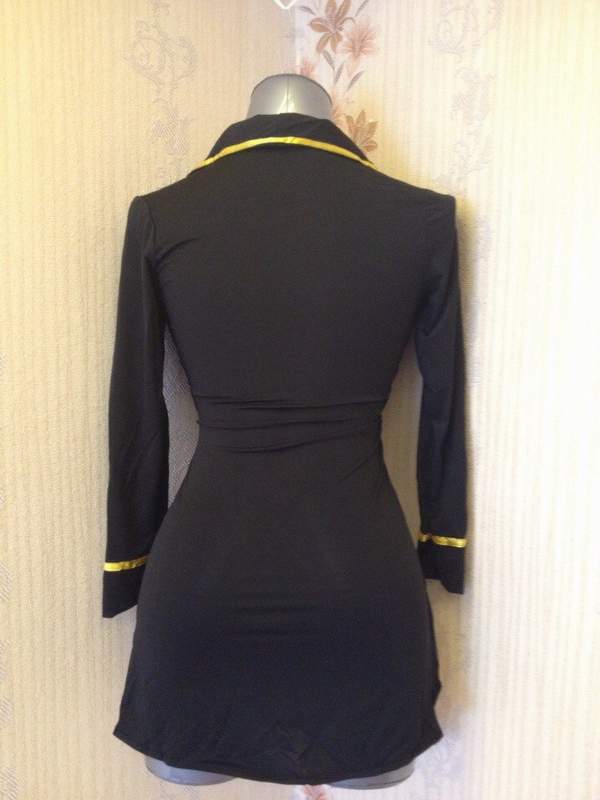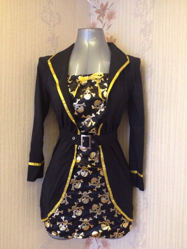 Костюм отважной женщины с пиратского судна. Платье-жакет выполено из эластичного материала, спереди декорировано золотыми черепами.