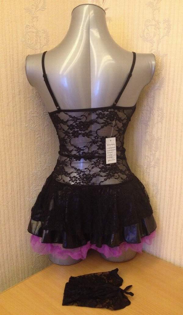 Маленькое черное платье с многослойной юбочкой будет игриво смотреться на фигуре. Модель выполнена из различных типов ткани: винила и кружева, спереди украшена шнуровкой. Рекомендуется использовать дополнительный подъюбник