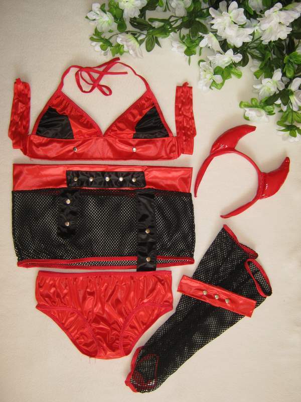 Комплектация: топ, трусики, перчатки, юбка, рожки, повязка на шею