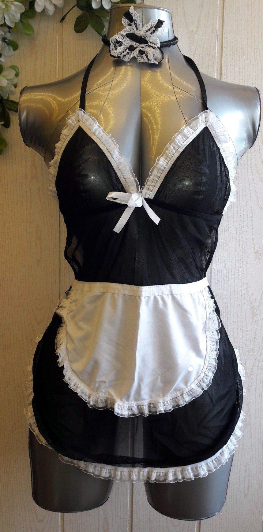 Полупрозрачное платье горничной выполнено из эластичной микросетки. Фартучек несъемный. Платье завязывается в трех местах на спине. В комплекте ободок с бантиком и трусики-стринги.